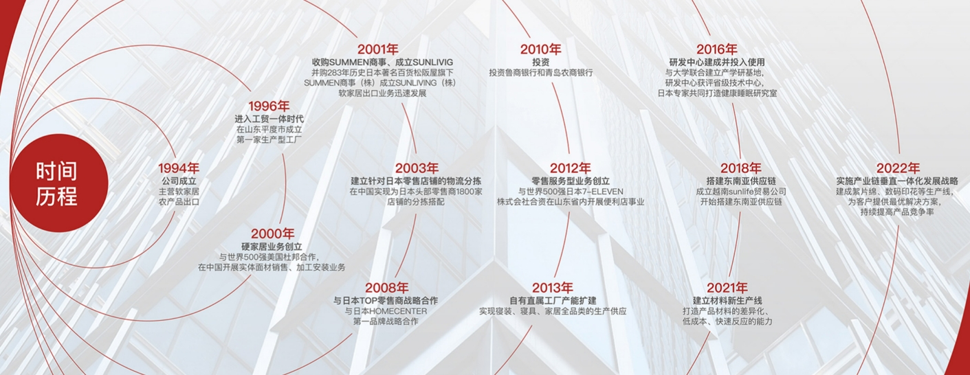 青岛上雅家居用品股份有限公司提供床上用品及家居家饰用品的贴牌代工(OEM\ODM)业务,本公司具备行业领先的从材料研发、商品设计、生产制造到物流配送的端到端供应链一体化服务能力,因诚信、专业、品质而备受客户信赖和好评。公司秉持绿色、环保、可持续发展理念,深入洞察客户的需求,与客户精诚合作,已经成为多家行业头部客户的首选战略供应商。 经过多年的深耕,本公司在多个方面建立起了独特的核心优势: 在产品开发方面,本公司在日本设有研发设计中心,实现在科技材料、制造技术、设计理念方面与世界优秀资源的融合。在制造方面,公司不但持续地对中国山东的12家直属工厂进行智能化和数字化的升级,实现了低本高效、快速反应的可靠供应,还于2017年在越南设立了贸易公司,致力于搭建东南亚的供应能力,实现供应链的多元化、安全化。在物流方面,公司实现了对实体零售商的按店分拣搭配配送和为电商客户的一件代发,帮助客户极大地实现了效率提升。 公司自成立以来获得了多项国家荣誉,是中国家用纺织品出口十强企业,公司被评定为高新技术企业、山东省企业技术中心、青岛市民营领军标杆企业,青岛市专精特新企业、青岛市创新型企业、青岛市先进制造业和现代服务业融合发展试点企业。