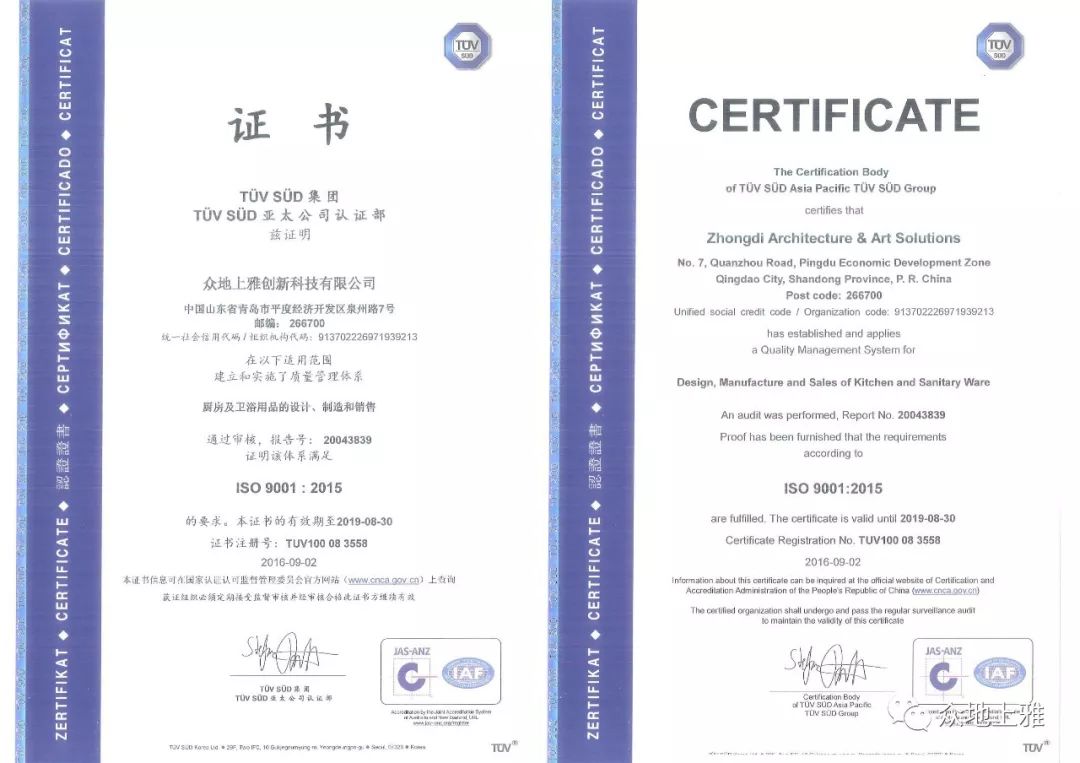 经过审核,专家组充分肯定了我司一直以来的质量管理体系所做的努力和取得的成效,对我司认证履行质量管理体系给予了高度评价。这也充分证明了众地上雅在厨房及卫浴用品的设计、制造和销售方面完全达到国际化标准。