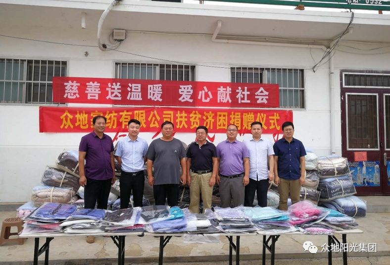平度市旧店镇东于家屯村以前是省级贫困村,是青岛市金融办精准扶贫帮扶村,赵国亮总经理带领众地家纺有限公司连续两年走进东于家屯村进行捐赠,随着公司的不断发展壮大,我们不忘回馈社会,以回报社会为己任,尽己所能,奉献爱心,帮助贫困人口走出困境。