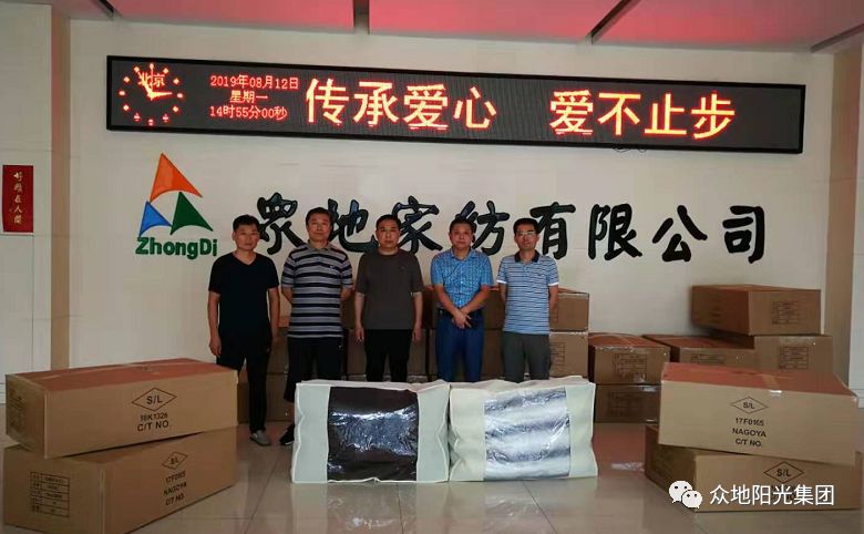 2019年8月12日众地家纺有限公司进行了“传承爱心.爱不止步”公益捐赠活动,平度市凤台街道办事处民政办、平度市慈善总会凤台街道分会、平度市夕阳红老年公益、平度市康乐福老年公寓的主要领导参加了此次捐赠仪式,我司直属工厂管理本部赵心刚本部长将承载爱心的300套被褥枕交到了两个老年公寓负责人的手中,为居住在养老院的老人们送去了健康舒适的床品。