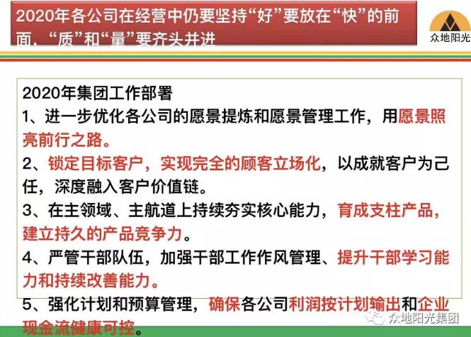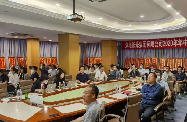 2020年7月19日上午,众地阳光集团2020年年中经营工作会议在集团二楼会议室隆重召开。 上半年,面对突如其来的疫情,众地人团结一心,众志成城,抢订单、抓管理,在政府关怀、政策支持下,公司取得了较往年同期更好的经营业绩。各公司总经理的工作报告紧紧围绕集团制定的经营方针,比照集团2020年年度经营工作会议确定的经营目标和年度重点工作布署的要求,不讲成绩不谈经验,总结上半年经营和管理中存在的问题,对下半年的工作开展进行了认真规划,以确保年度绩效目标的达成。