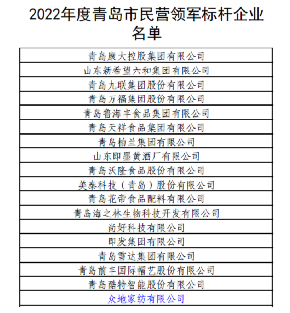 2022年10月31日,青岛市民营经济(中小企业)发展工作领导小组办公室公布了“2022年度青岛市民营领军标杆企业”名单,众地家纺有限公司荣列其中。