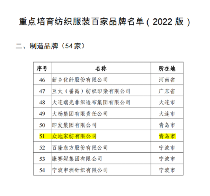 2022年11月20日, 国家工业和信息化部办公厅关于印发的《重点培育纺织服装百家品牌》54家制造品牌名单中,众地家纺有限公司荣列其中,这是众地家纺有限公司“制造品牌”在2021年获得“青岛制造”品牌建设重点企业称号后,获得的国家级荣誉。
