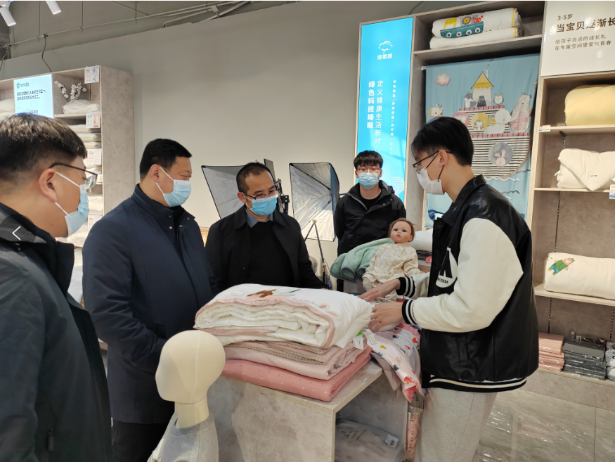 詹磊书记一行先后参观了公司线下销售展示中心,通过对功能性被、褥、枕、件套等产品的体验,及公司所倡导的“上雅生活”品牌定位和发展理念的了解,给予了高度认同。 在随后的座谈中,詹磊书记介绍了连云港市赣榆区班庄镇重点发展产业情况,该区域有着较大规模的化工产业园区,特别在纤维制造方面具备一定的优势,在当地已经形成规模化的产业集群,衷心希望公司能够与当地企业携手发展。 在产业链前端,公司持续加强对于纺织纤维、面料的研发合作投入,加快产品的创新迭代速度,在“健康、时尚、绿色、科技、可持续发展”的研发项目推进中,2022年已经申请专利近20项,公司也一直积极的寻求与产业链前端优势企业,通过多种模式建立长久合作,发挥各自优势,技术与资源共享,实现互利互赢。