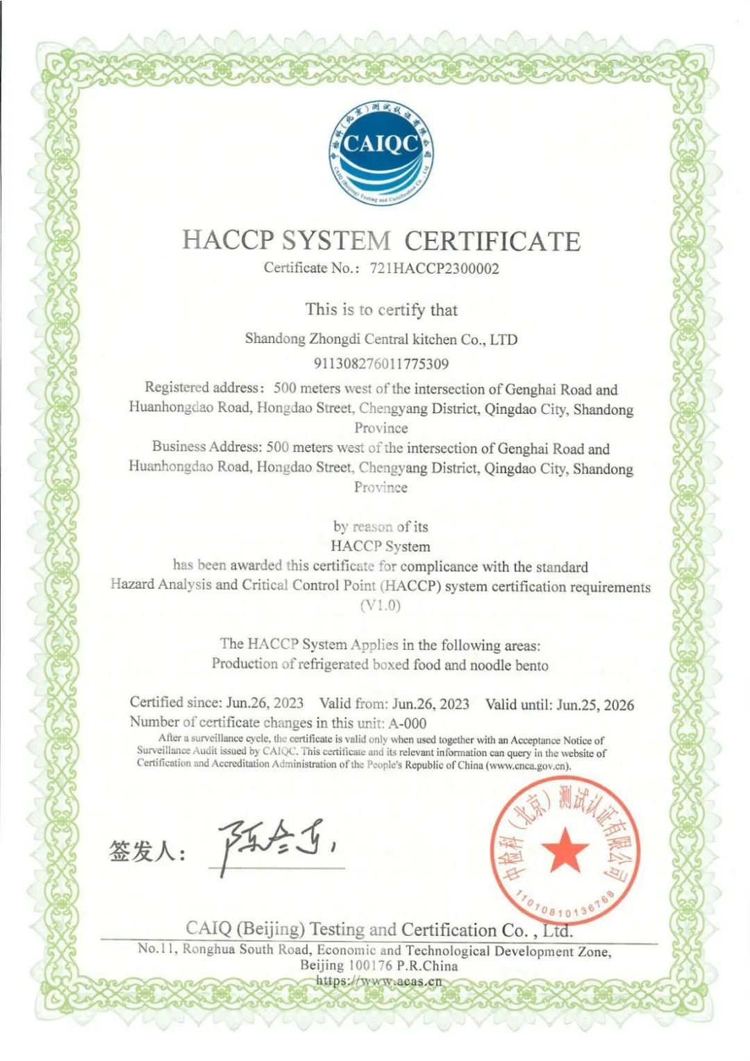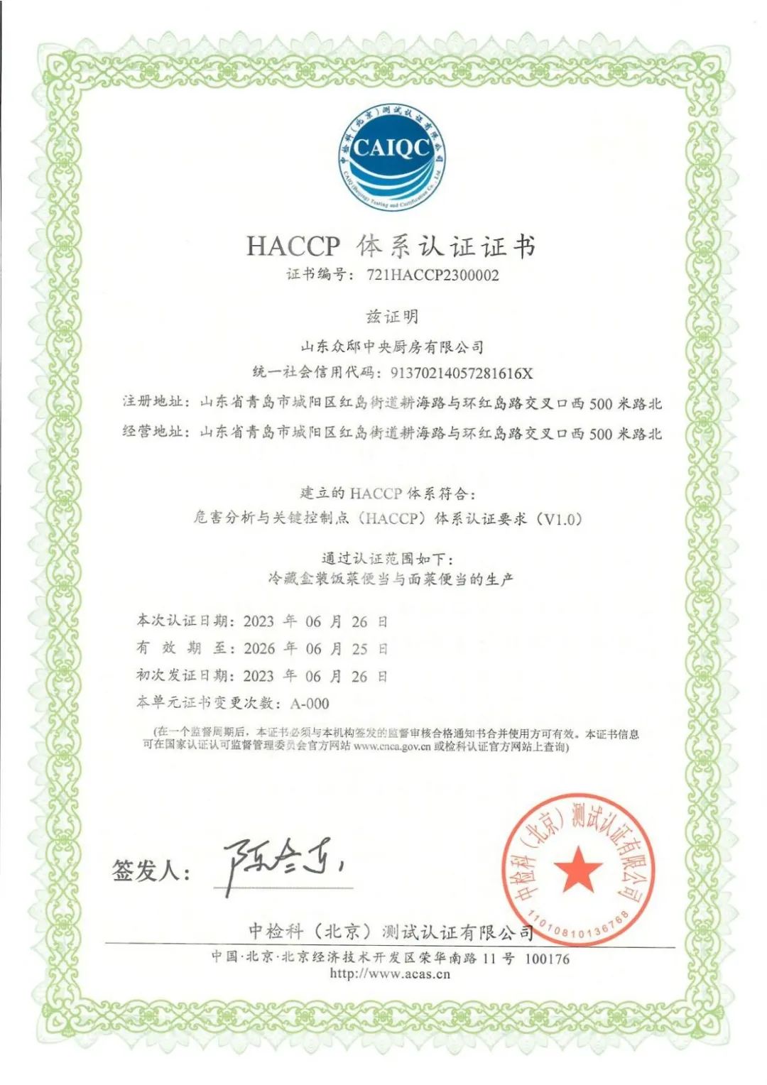 2023年6月,山东众邸中央厨房有限公司凭借严谨的体系、务实的作风,严把安全生产质量关,顺利通过HACCP认证,获颁《危害分析与关键控制点(HACCP)体系认证证书》