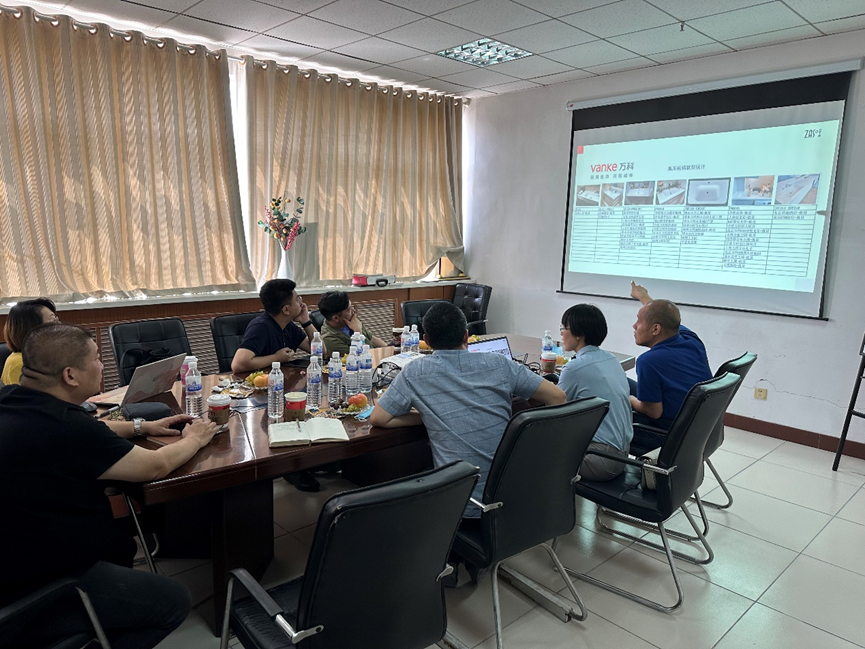 8月22日,万科开发经营本部领导带队考察工厂,众雅公司总经理李珍江携产品、生产、质量、销售人员与客户开展了全方位的交流。 李总带领万科开经人员参观了青岛中心工厂的生产工艺和出产的产品。在工厂生产线旁详细解答了客户的疑问。
