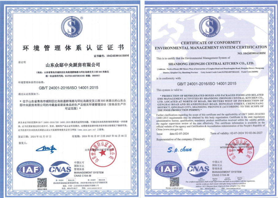 山东众邸中央厨房有限公司于2024年2月份经过全面、严格、细致的审核认定,荣获“ISO14001环境管理体系认证”证书。本次体系认证的通过,进一步证明了公司管理向更加规范化、标准化、专业化迈进,是对公司持续健康发展的重要保证。