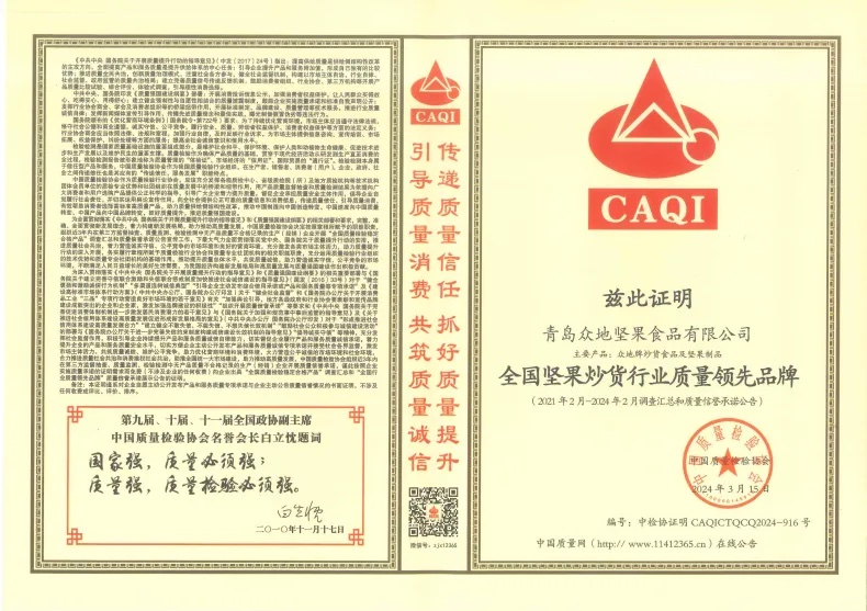 三春回暖,喜迎捷报!近日,众地坚果在经过一系列严格的审核后,获得了中国质量检验协会(CAQI)颁发的“全国坚果炒货行业质量领先品牌”荣誉称号!