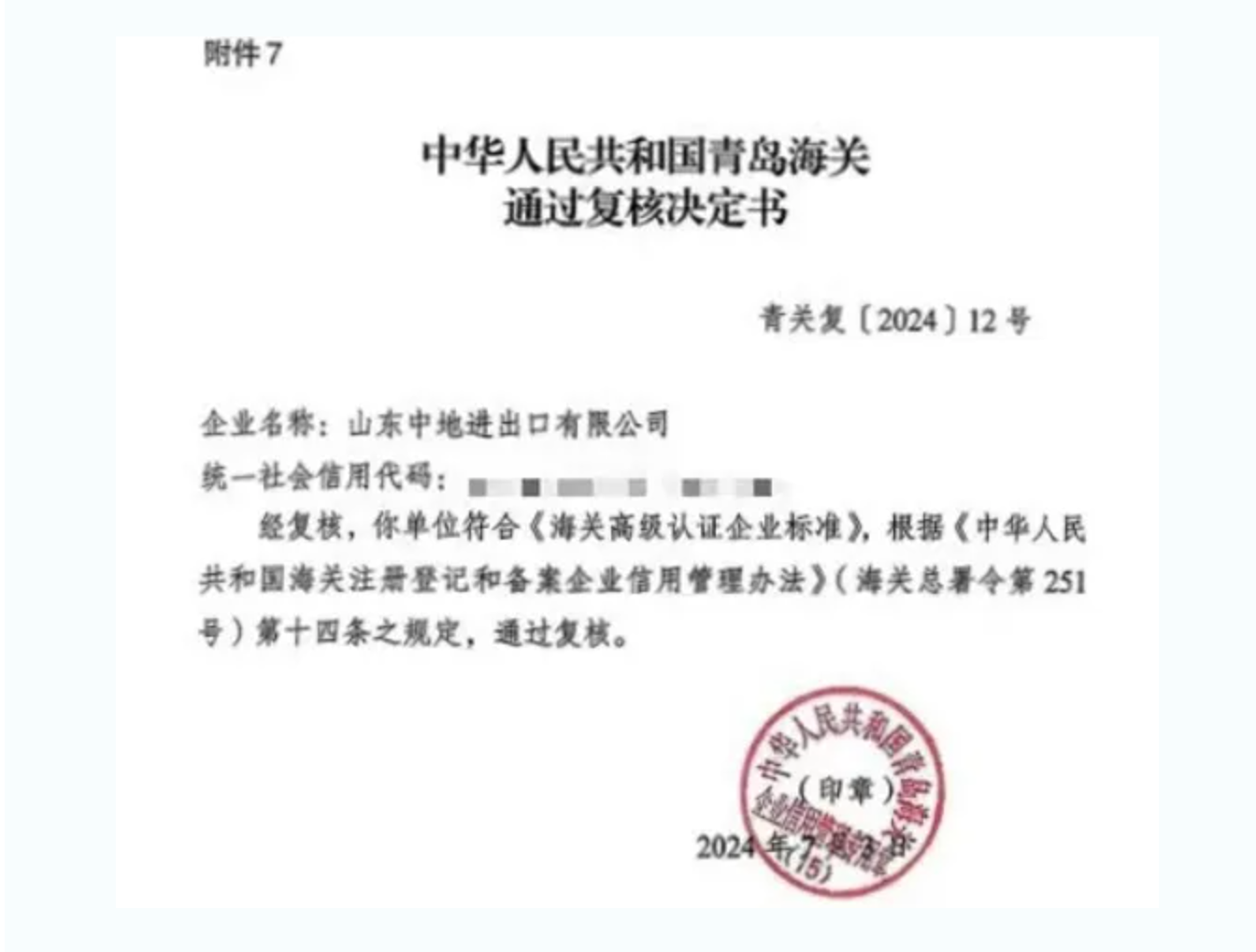 山东中地进出口有限公司是全国首家非生产型经核准出口商。这项复核认证的顺利通过,验证了公司今近年来在进出口单证、信息系统、内部审计、财务状况、遵守法律法规、外部信用、经营场所安全、人员安全、货物物品安全、运输工具安全、商业伙伴安全、贸易安全培训等方面AEO体系运行的有效性,也体现了公司经营信誉度和品牌公信力的“软实力”。