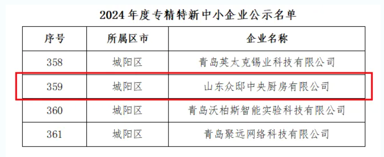 近日,青岛市民营经济发展局发布了《关于公示2024年度专精特新中小企业拟定名单的通知》,山东众邸中央厨房有限公司凭借其卓越的创新能力、精湛的技术实力、精细化的管理模式以及独特的市场竞争力,成功上榜。