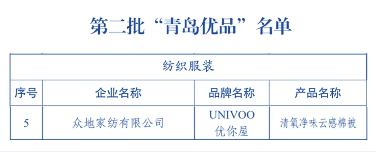 近日,青岛市市场监督管理局关于发布《第二批“青岛优品”名单的公告》,众地家纺有限公司“UNIVOO 优你屋”品牌产品“清氧净味云感棉被”荣列其中,彰显出公司在标准领先、自主创新、品质卓越、市场公认等方面具备了较高优势。