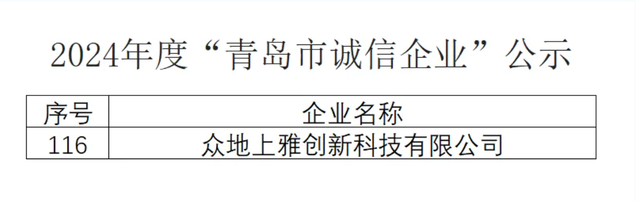 12月11日,青岛市诚信企业建设委员会、青岛市商业联合会公布2024年度“青岛市诚信企业”认定文件,众地上雅创新科技有限公司荣列认定企业名单中。