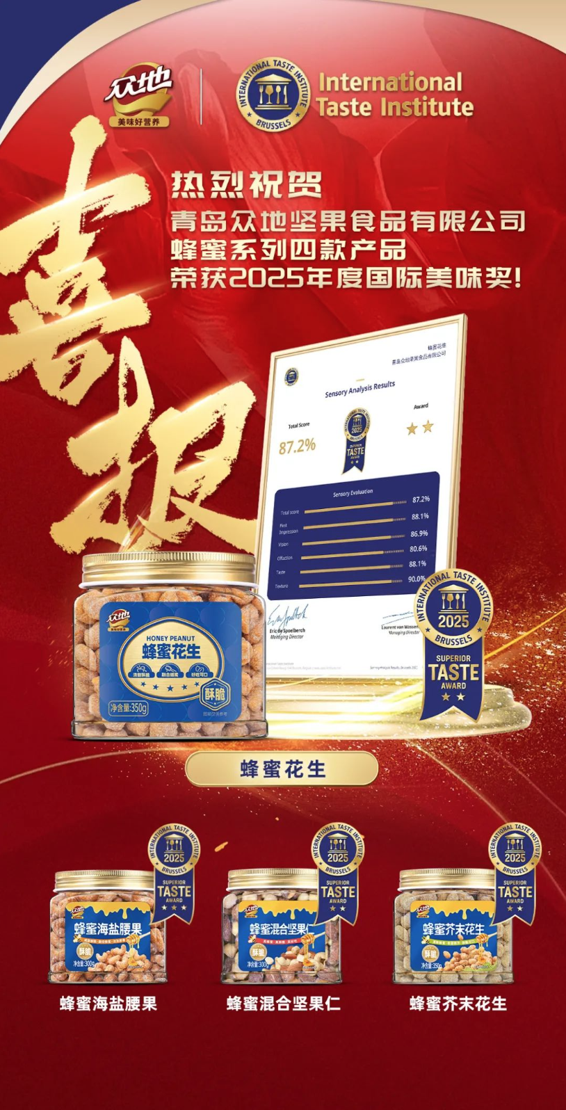 日前,在国际风味评鉴所 (International Taste Institute,简称ITI)揭晓的2025年国际美味奖获奖名单中,青岛众地坚果食品有限公司凭借富有竞争力的产品,通过全球美味挑战,在数千款产品中突围,一举拿下四枚星级奖章!其中,蜂蜜海盐腰果获得最高等级三星奖,充分演绎国民新尚坚果品牌的卓越品质和强劲实力。