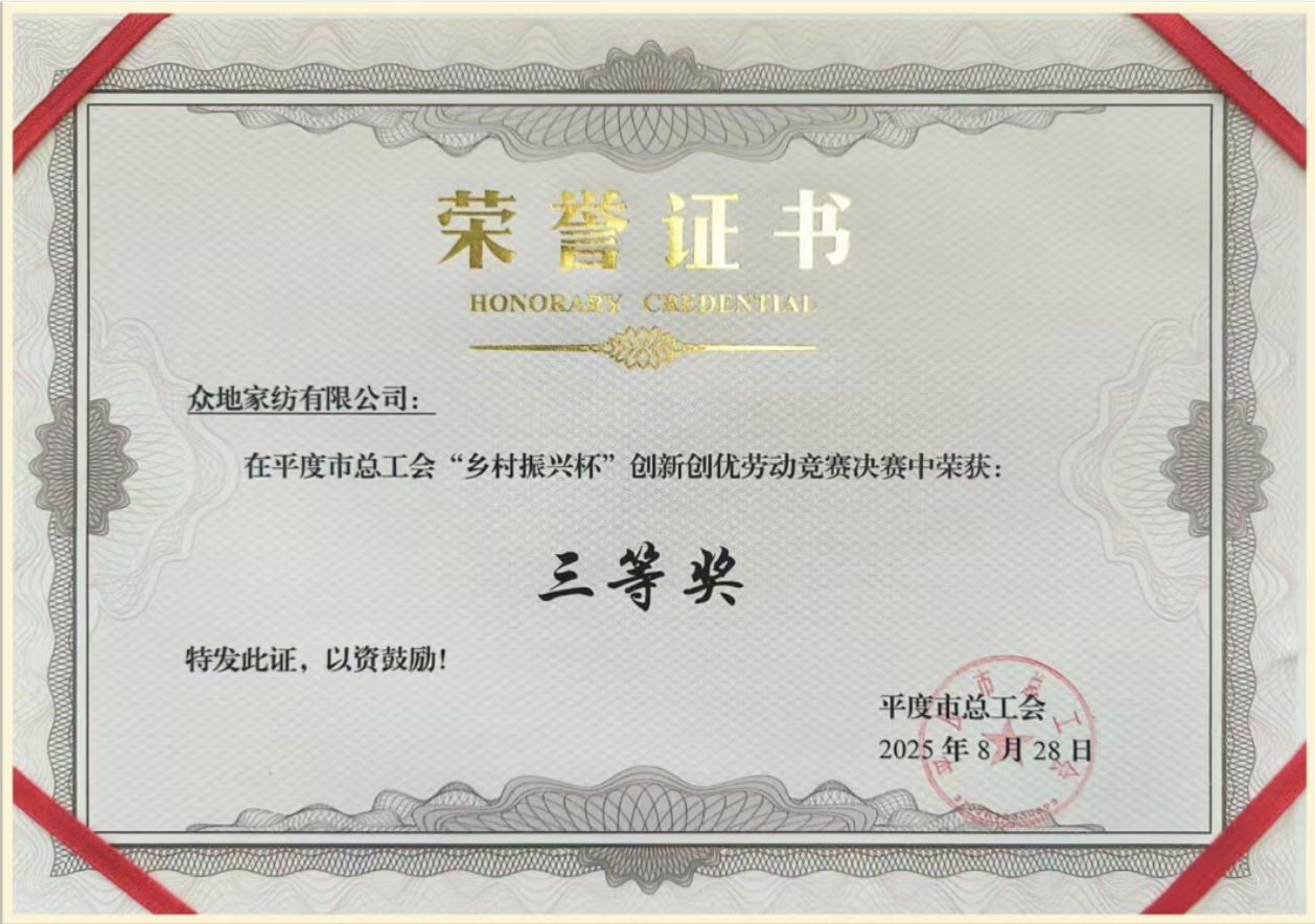荣誉属于过去,奋斗铸就未来。众地家纺将再接再厉,持续在提升产业工人技能、推动农民工就业创业等方面主动担当、积极作为,为乡村振兴事业贡献更大力量。
