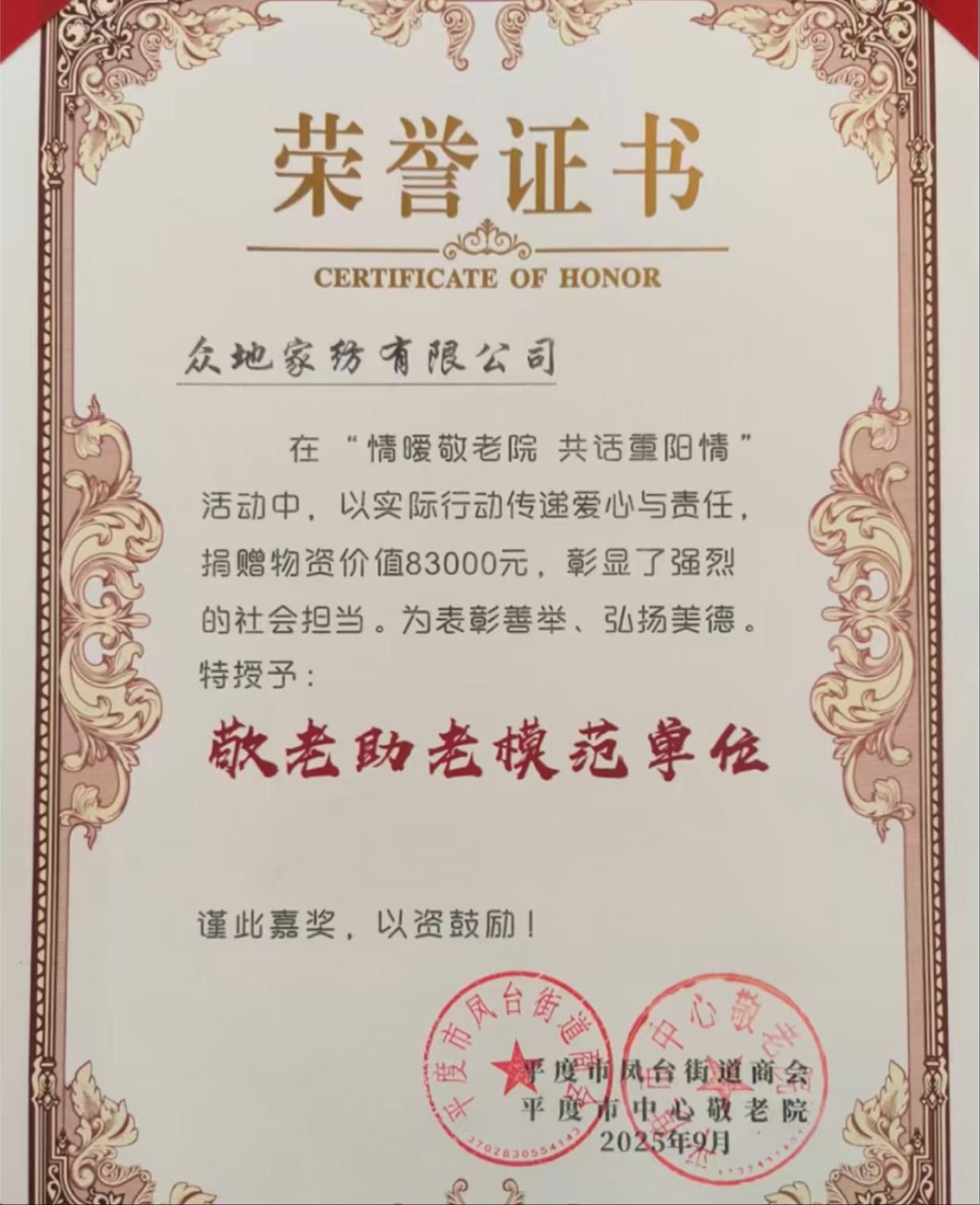 凭借对敬老公益事业的热忱投入与实际行动,众地家纺荣获“敬老助老模范单位”称号——这一荣誉,不仅是对我们本次参与慰问行动的肯定,更是对企业长期坚守社会责任的认可。