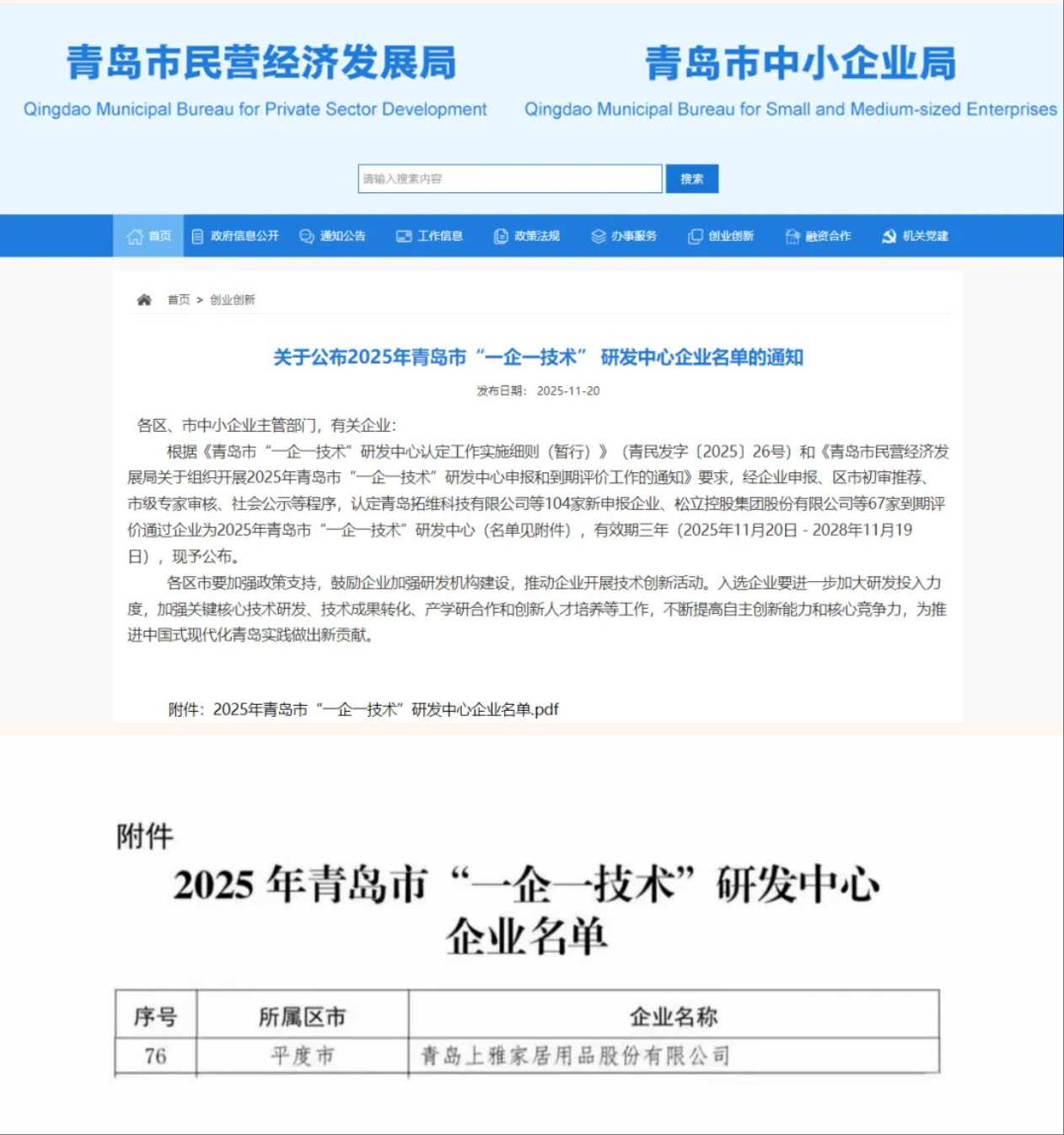 近日,青岛市民营经济发展局公布2025年度青岛市“一企一技术”研发中心企业名单,青岛上雅家居用品股份有限公司(以下简称“上雅家居”)凭借在家居用品领域突出的技术创新能力与完善的研发体系,成功入选。标志着上雅家居在科技创新体系建设和自主研发实力方面迈上了新的台阶。