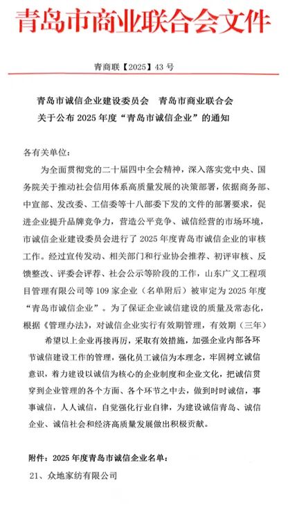诚信是企业立身之本、发展之基。展望未来,众地家纺将继续坚守诚信经营初心,不断完善企业信用体系,以更高标准提升产品与服务品质。同时,公司将持续发挥行业标杆作用,积极参与行业诚信生态建设,携手合作伙伴共建透明、健康的商业环境,为青岛经济社会高质量发展贡献家纺力量。